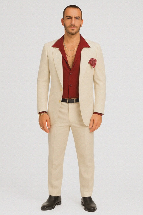 - Matching Trousers: Tapered for a modern fit. Trousers feature a six-inch drop, meaning the waist size is 6 inches smaller than the jacket size. Pants are unfinished at the bottom for custom hemming.