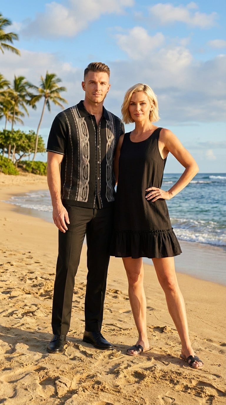 Keywords: mens black walking suit set, gray pattern outfit men, mens summer outfit set, casual shirt and pants set men, mens vacation outfit, knit walking suit men, mens leisure wear set, black casual outfit men.