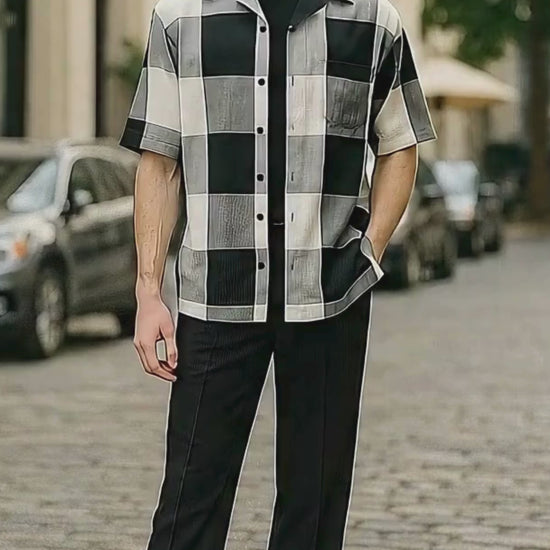 Make a bold style statement with this men’s black and white checkered short sleeve shirt set, designed for comfort and modern appeal. Featuring a classic button-up shirt with a relaxed fit and matching solid pants, this outfit is perfect for casual outings, weekend gatherings, vacations, and everyday wear.