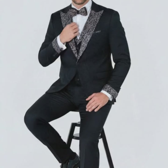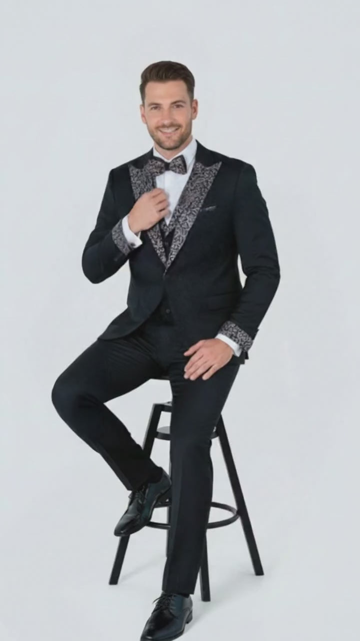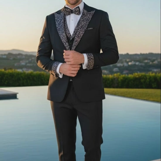 Elevate your formal style with this men's black embellished tuxedo suit, designed for those who want a refined yet eye-catching look. Crafted from a premium-quality fabric, this tuxedo offers a sleek slim fit, smooth structure, and all-day comfort. The classic black color is enhanced with intricate patterned embellishments on the shawl lapel, sleeve cuffs, and matching bow tie, adding a luxurious touch to your sophisticated ensemble.