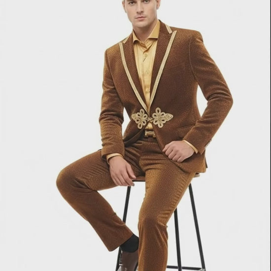 Pair this bronze velvet suit with a gold or cream shirt and polished dress shoes for a complete look that exudes elegance and sophistication at any formal or festive event.