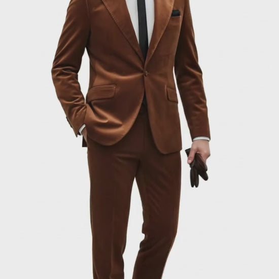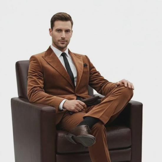 Make an unforgettable impression with this Mens Brown Velvet 2-Piece Suit, tailored for men who appreciate luxurious texture, modern silhouettes, and standout formal style. Crafted from premium velvet in a rich rust-copper brown tone, this suit brings together elegance, comfort, and contemporary fashion—perfect for weddings, parties, festive events, galas, prom nights, and upscale evenings.