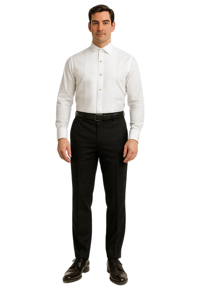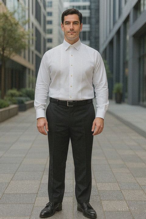 Finished in a sharp white tone and accompanied by gold shirt studs, this tuxedo shirt is a formalwear essential—perfect for weddings, galas, proms, opera nights, and upscale evening events.