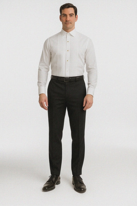 Made from 100% high-quality cotton, this tuxedo shirt offers superior breathability, comfort, and a smooth, luxurious feel against the skin. The classic wing collar is ideal for bow ties, while the pleated (diamond placket) front adds a distinguished, old-world charm synonymous with formal dressing. Convertible cuffs provide versatile styling options, allowing you to wear the shirt with cufflinks or standard buttons depending on your preference.