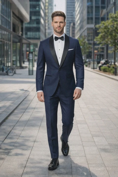 The deep navy blue color offers a sophisticated alternative to traditional black, delivering a modern, upscale appearance that feels both timeless and distinctive. Tailored with precision, this tuxedo features clean lines and a streamlined silhouette that enhances the shoulders, chest, and waist for a sharp, masculine profile. The design reflects refined craftsmanship inspired by high-end tailoring seen on screen, making it a standout choice for men who want elegance with a cinematic edge.