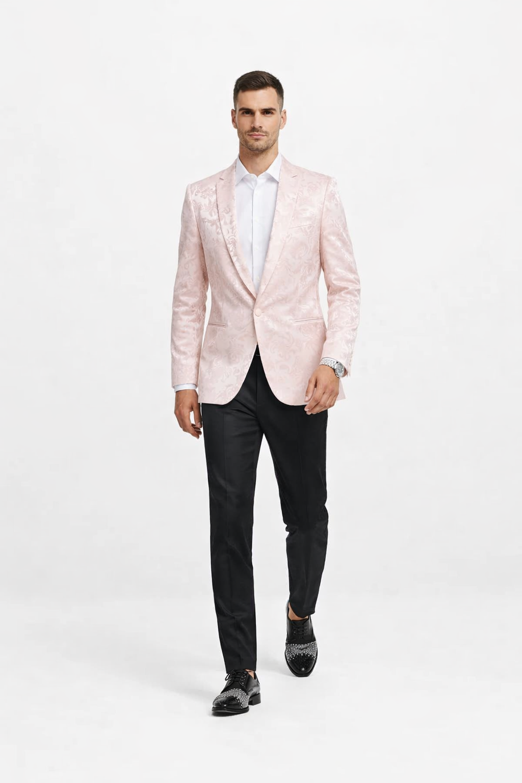 Pair this Pink Floral Empire Prom Blazer with black tuxedo trousers, a crisp white shirt, and black or rose-gold bow tie for an effortlessly chic prom or wedding look. For a more contemporary flair, wear it open over a black turtleneck with fitted dress pants and patent loafers. The versatility of the pink floral pattern makes it suitable for both formal and semi-formal occasions.