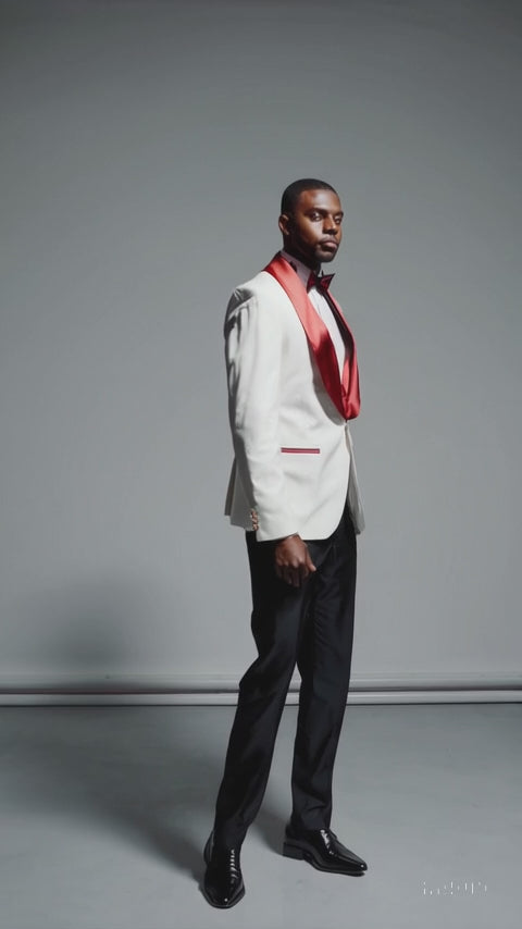 Elevate your formal style with the Mens Groom Wedding Shawl Collar - Paisley Red Velvet 4-Piece Suit. Crafted from imported Turkish fabric, this suit showcases luxurious texture and exceptional tailoring. The slim-fit jacket features a single-button closure, velvet shawl collar, dual vents, and full lining for all-day comfort. Matching flat-front black trousers offer a sleek, modern silhouette with a zipper closure. Thoughtfully designed with both outer and inner pockets for practicality. Complete with a matching bowtie, this wool and viscose blend ensemble is perfect for weddings, galas, or any high-class event.