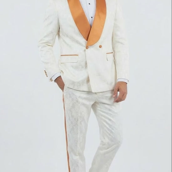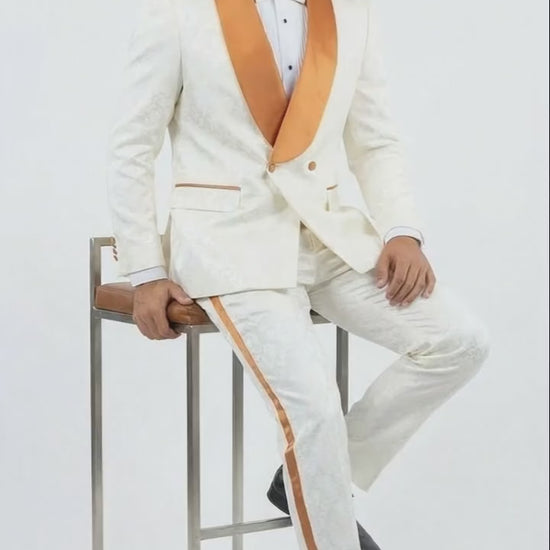 Men's Ivory and Gold Jacquard Tuxedo Suit Bowtie Formal Wedding, Prom, and Gala Outfit in Cream Off White color