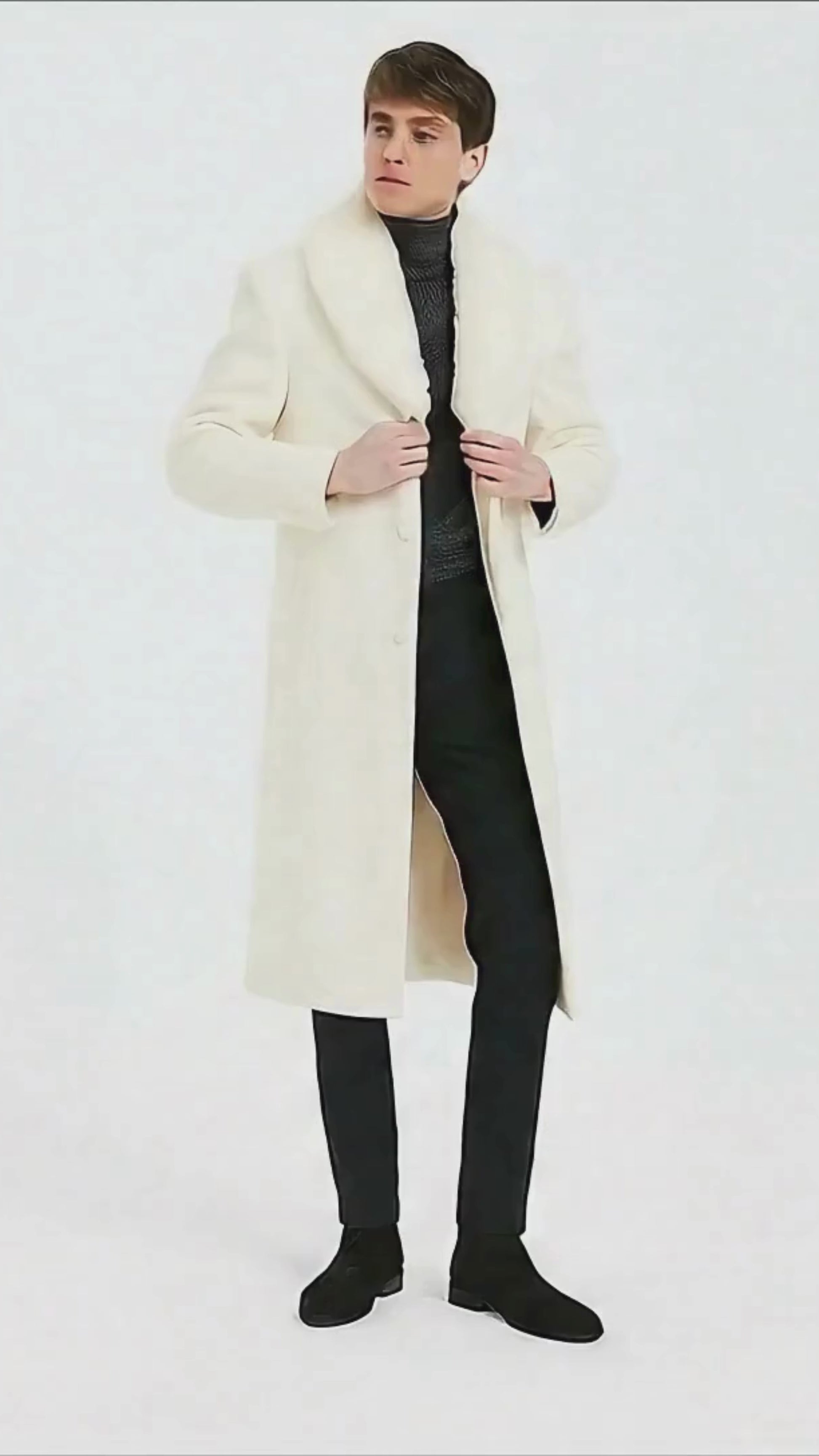 Make a bold statement in refined style with this men’s white full-length overcoat, designed for sophistication and warmth. Featuring a luxurious faux fur shawl collar, this coat blends classic tailoring with a modern, fashion-forward look. Its sleek silhouette and premium construction make it the perfect choice for both formal and casual winter wear.