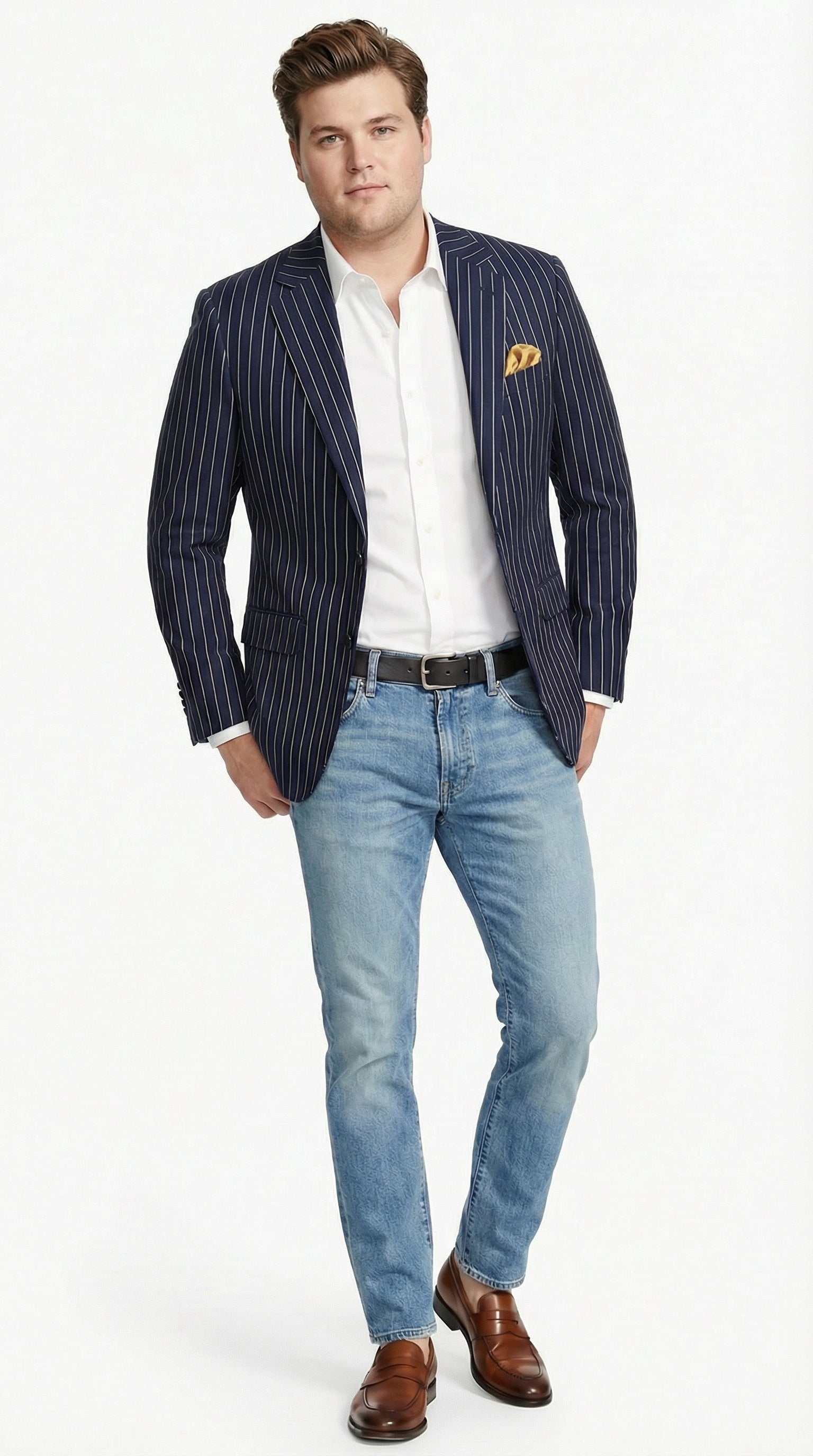 The blazer features elegant vertical pinstripes that enhance its sharp appearance while maintaining a timeless style. The structured design, classic lapels, and clean finishing make this men’s navy blue formal blazer ideal for office wear, business meetings, evening events, and upscale casual outings. It pairs effortlessly with dress shirts, trousers, chinos, or denim for a polished yet relaxed look.