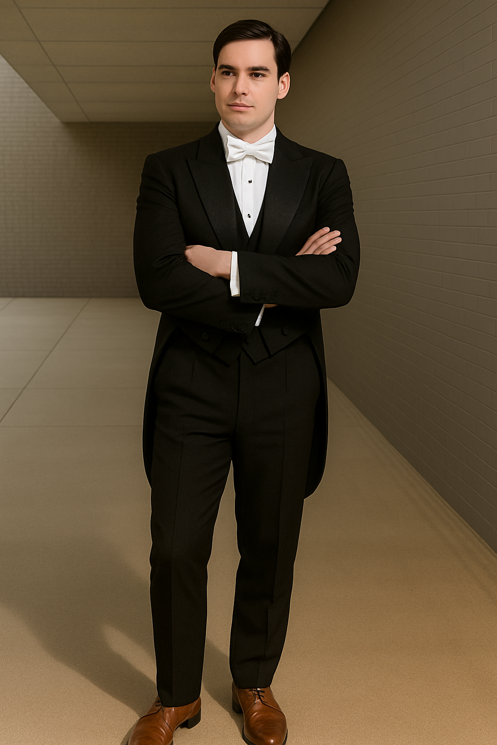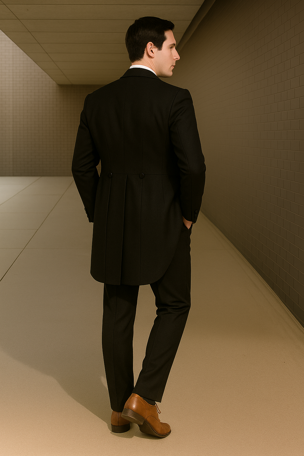 From the moment it is seen, the deep, rich black fabric captures attention with its commanding and enigmatic aura. The tailcoat, extending gracefully behind, adds a sense of grandeur and movement, enhancing the wearer’s stature with every step. Its structured shoulders and precisely tailored fit ensure a powerful silhouette, while the long tails evoke the timeless sophistication of the opera house.