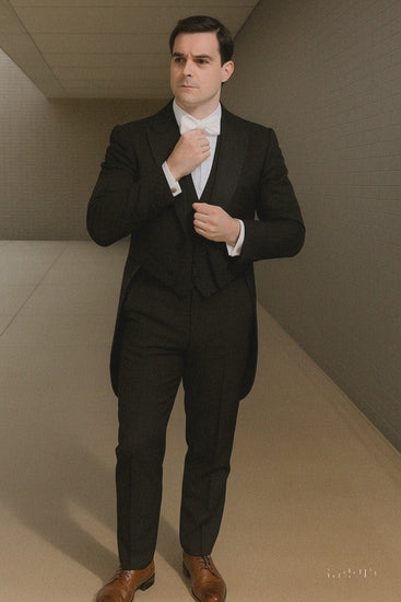 The satin peak lapels provide a refined contrast, shimmering subtly under the lights to emphasize the tuxedo’s formal prestige. Worn with matching trousers in a classic straight cut, the ensemble flows together seamlessly, balancing dramatic flair with poised elegance. The crisp white dress shirt underneath offers a perfect contrast, bringing depth and clarity to the overall look.
