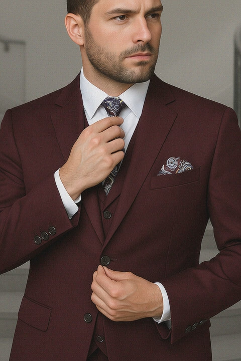 Get ready to do the news. This vested suit in burgundy will have you looking like Ron...