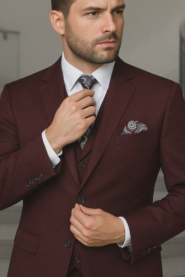 Get ready to do the news. This vested suit in burgundy will have you looking like Ron Burgundy in Anchorman. It features a 2 button jacket, with matching vest, and flat front pants.