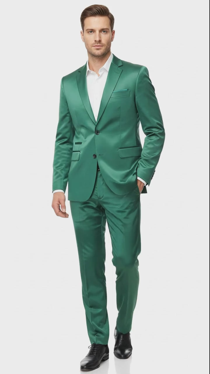 This green sateen suit blends elegance with modern flair. Whether paired with a crisp white shirt or a bold patterned tie, it ensures you stand out with confidence and timeless sophistication.