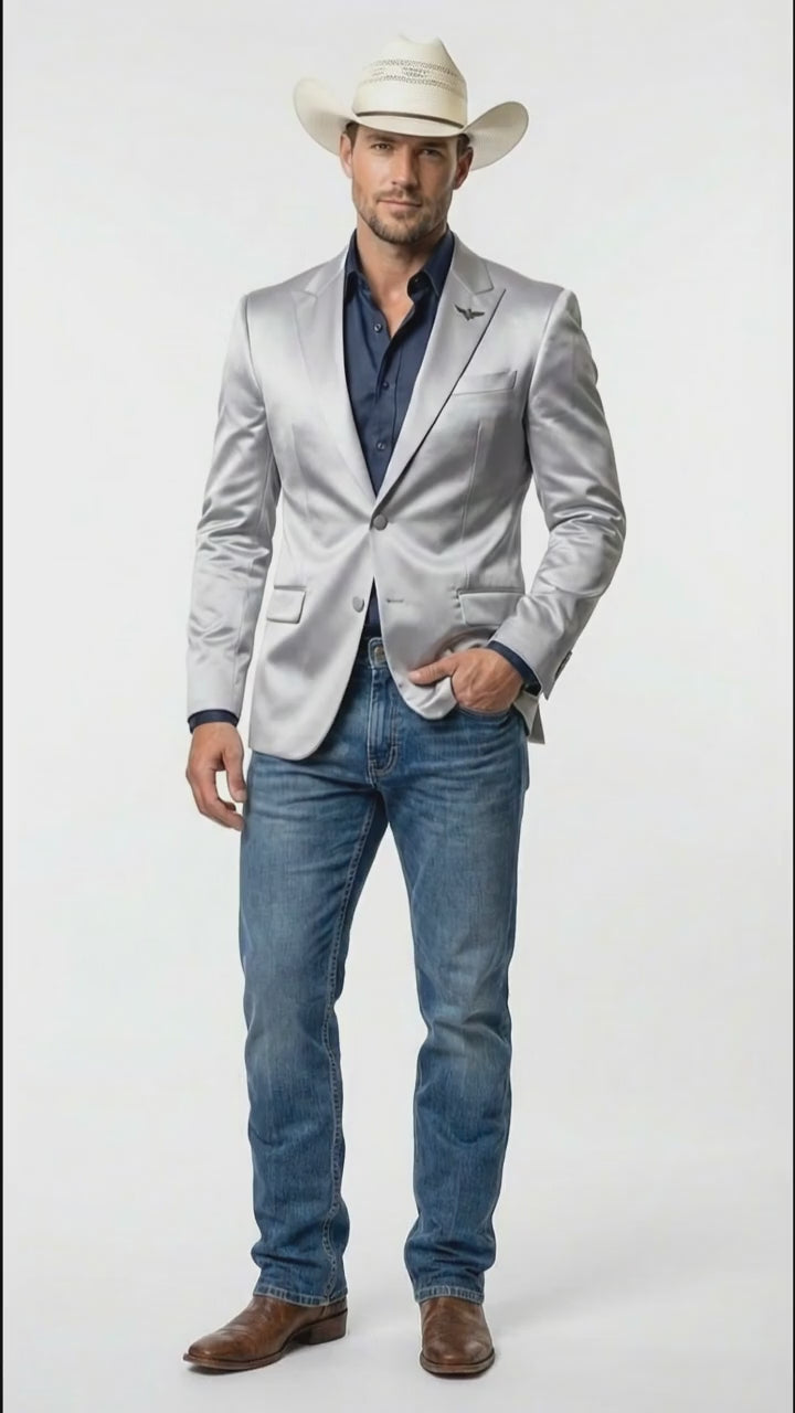 Featuring a structured design, sharp lapels, and a single-button front, this men’s silver western blazer offers a confident and polished silhouette. The glossy silver color adds a luxury feel, making it ideal for country events, parties, stage performances, night outings, weddings, and fashion-forward evening wear.