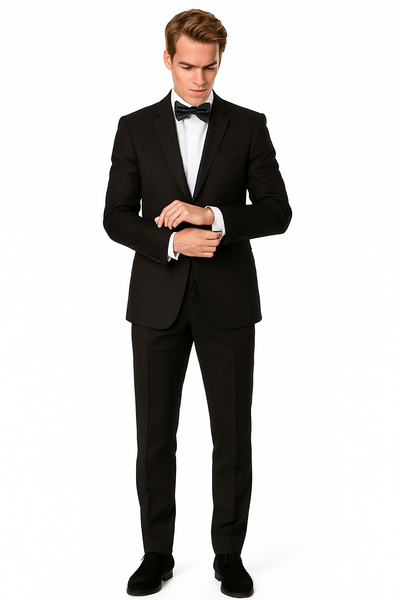 How to wear this tuxedo is just as important as the occasion itself. Pair it with a white tuxedo shirt—preferably one with a pleated front or a bib-style panel—to maintain a traditional and refined look. The collar should be either wingtip or spread, depending on your preference and face shape. Match the ensemble with black patent leather shoes or polished oxfords to maintain a streamlined and clean appearance. The trousers should have a gentle break and sit perfectly on the shoe without bunching. Ensure that the jacket fits close to the body, especially around the waist and shoulders, emphasizing the tuxedo's slim-fit profile.