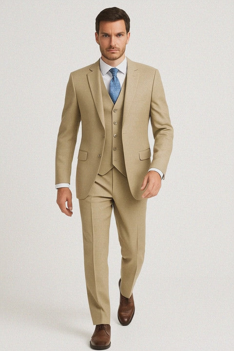 This Slim fit 3 piece vested suit is perfect for any event or wedding. It features a solid color fabric. 2 Button jacket closure. Side Vents. Flat Front Pants.
