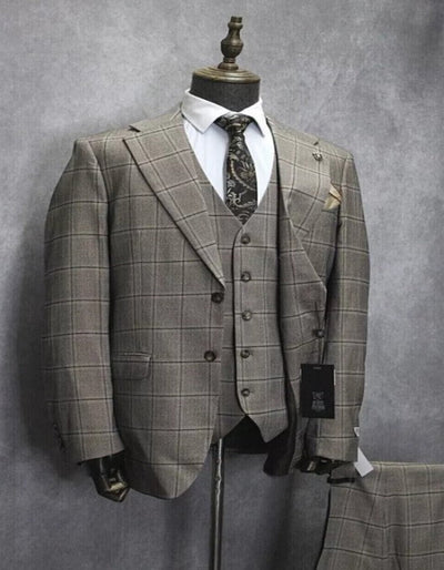 Mens Two Button Notch Lapel Plaid Pattern Suit Tan ~ Brown