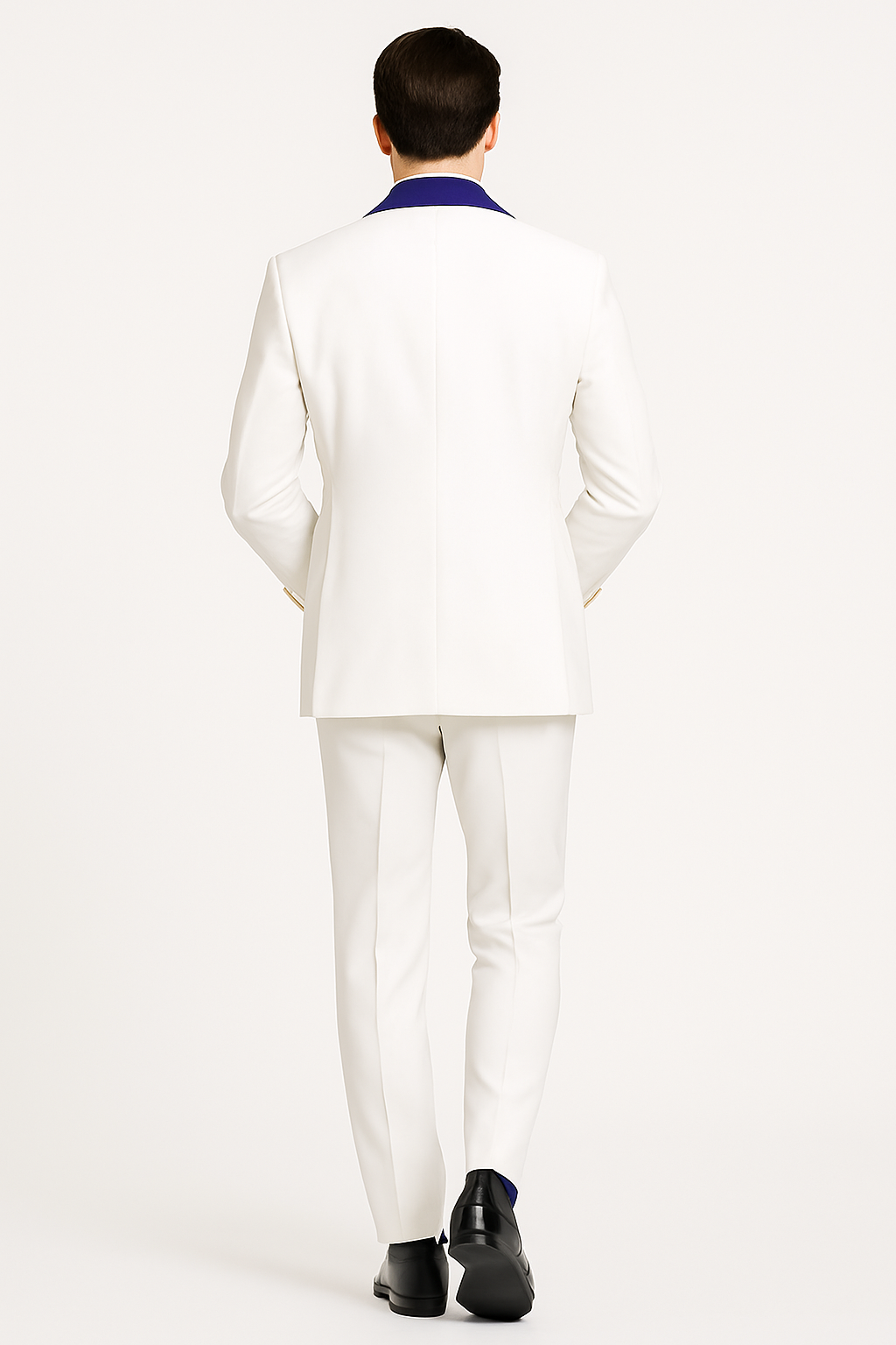 At the center of this striking ensemble is the wide royal blue velvet shawl lapel, a feature that instantly sets it apart from more traditional tuxedos. The wide lapel design frames the chest and face with authority, while the velvet texture adds a sense of luxury and depth that can only be appreciated in person. Royal blue, a color long associated with nobility and sophistication, enhances the richness of the jacket and adds dimension to its overall appearance. When paired with the ivory paisley fabric, the contrast creates a visual balance that is both classy and daring.