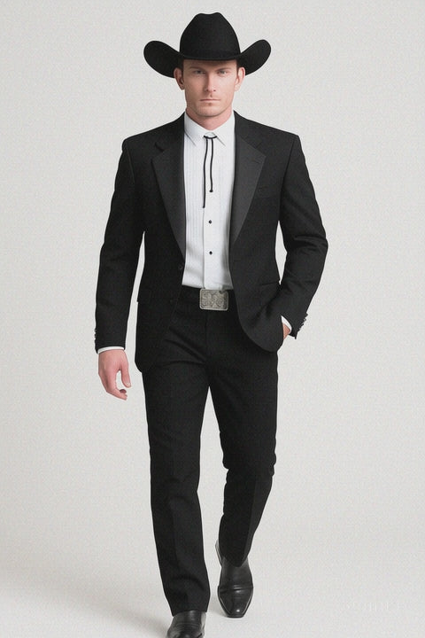Accessories play a key role in bringing out the best of this Western-inspired tuxedo. A bolo tie with silver tips or a Western-style bow tie is almost essential, offering a signature cowboy-inspired touch. Add a cowboy hat in black felt or straw (depending on the season) for outdoor or semi-formal events that lean into Western culture. For the pocket, consider a decorative pocket square in subtle earth tones, silver, or even turquoise to enhance the Western vibe without overpowering the look. Cufflinks can feature Western motifs such as horseshoes, longhorn designs, or turquoise stones for added character.