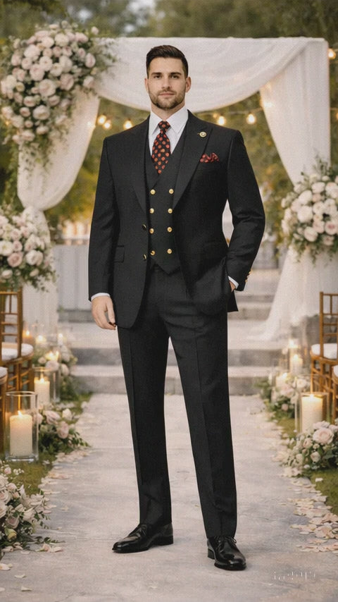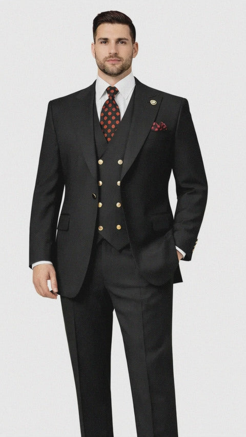 Rossiman Brand Black Suits - 1 Button Suit Peak Lapel Double Breasted Vest