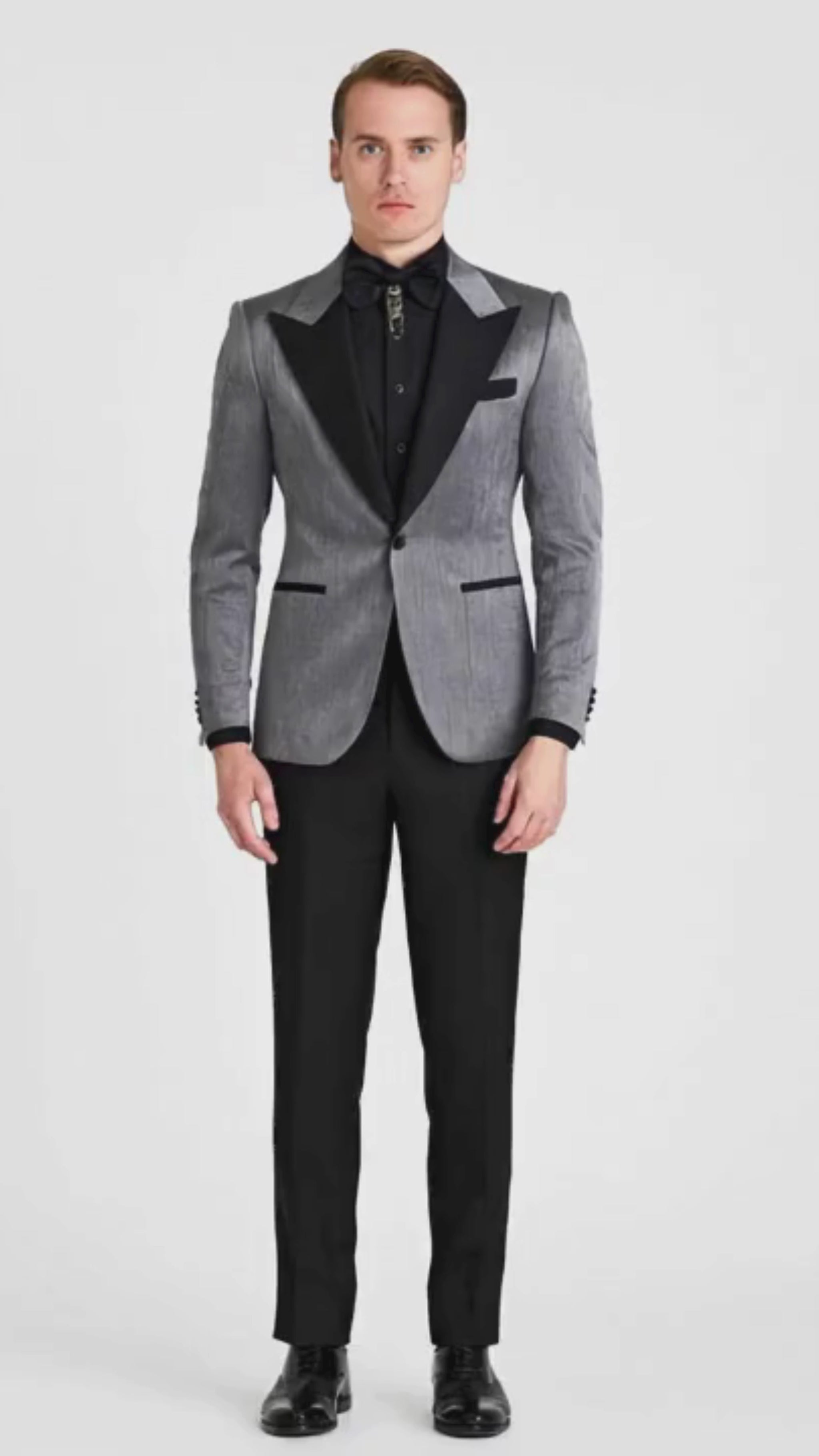 Silver Metallic Tuxedo Suit with Black Satin Peak Lapel Mens Slim Fit Formal Wedding and Prom Attire in Charcoal Grey With Pants