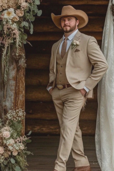 This cowboy wedding suit combines rustic western heritage with refined tailoring, making it a standout choice for special occasions. The suit features a tan blazer and matching trousers, designed with a tailored fit to ensure comfort and sophistication. Its versatile style is enhanced with western-inspired details, making it ideal for country weddings, outdoor events, and themed celebrations. Crafted from high-quality fabric, the suit delivers durability while maintaining a polished look. With its timeless design, it perfectly blends classic formalwear with cowboy charm.
