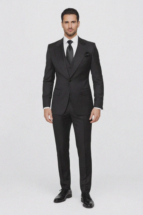 The wide leg pleated pants offer a nod to vintage menswear with a contemporary twist, allowing for easy movement and a powerful statement. Paired with the sharp lines of the wide peak lapel and clean single-breasted vest, this ensemble is perfect for fashion-forward professionals, creatives, grooms, or anyone seeking a standout formalwear piece.