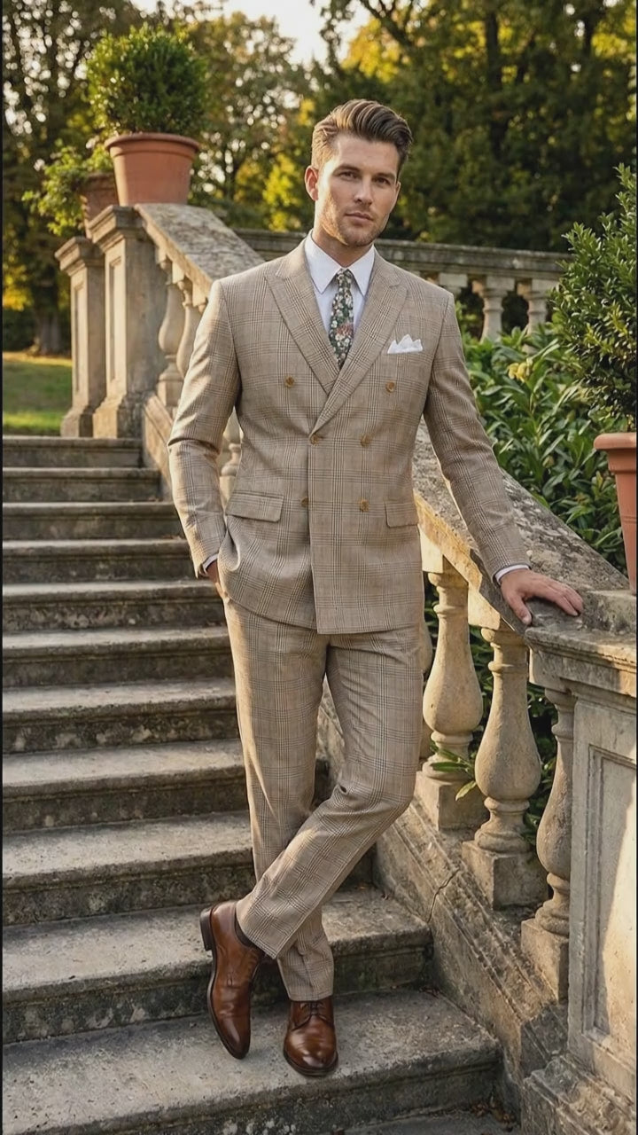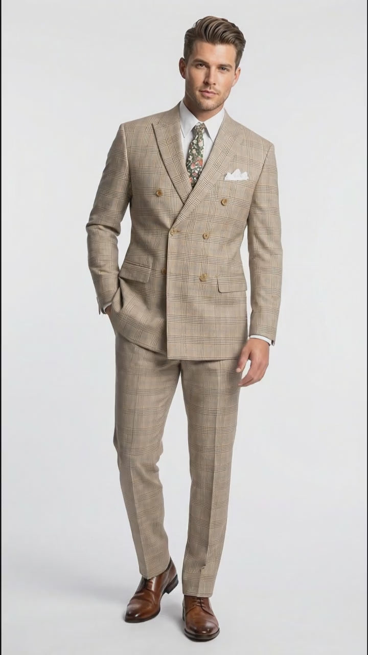 Vinci men’s suit, beige plaid suit for men, checkered men’s suit, double breasted suit Vinci, formal beige suit, wedding suit men, classic men’s suit set, business suit plaid